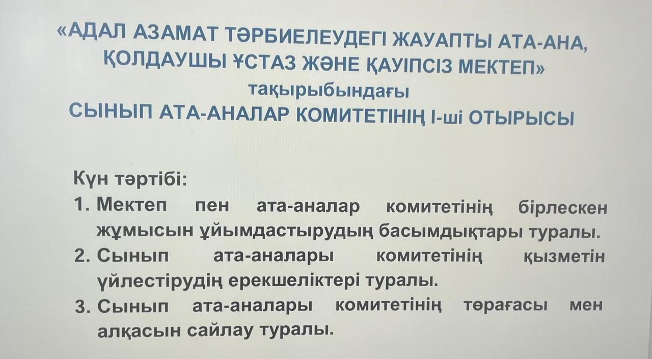 "Адал азамат тәрбиелеудегі жауапты ата-ана, қолдаушы ұстаз және қауіпсіз мектеп" тақырыбындағы сынып ата-аналар комитетінің 1-ші отырысы